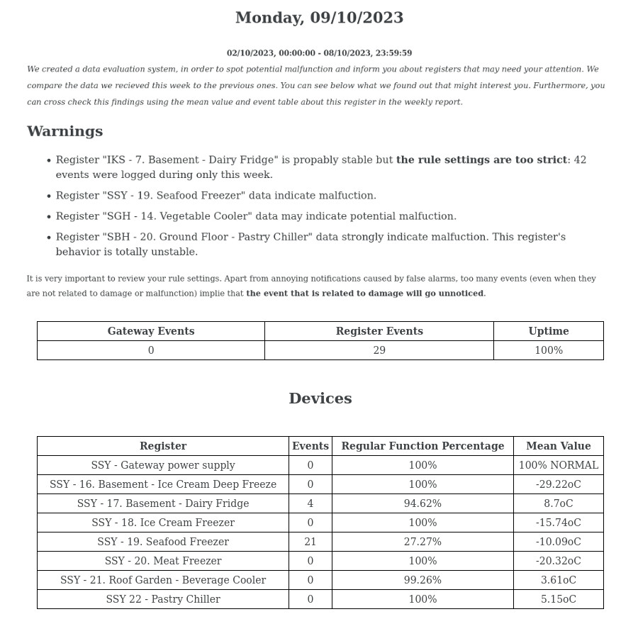 • Automatic Weekly Assessment: Weekly automated data assessment for anomaly detection and equipment malfunction, with a report sent to your email every Monday.