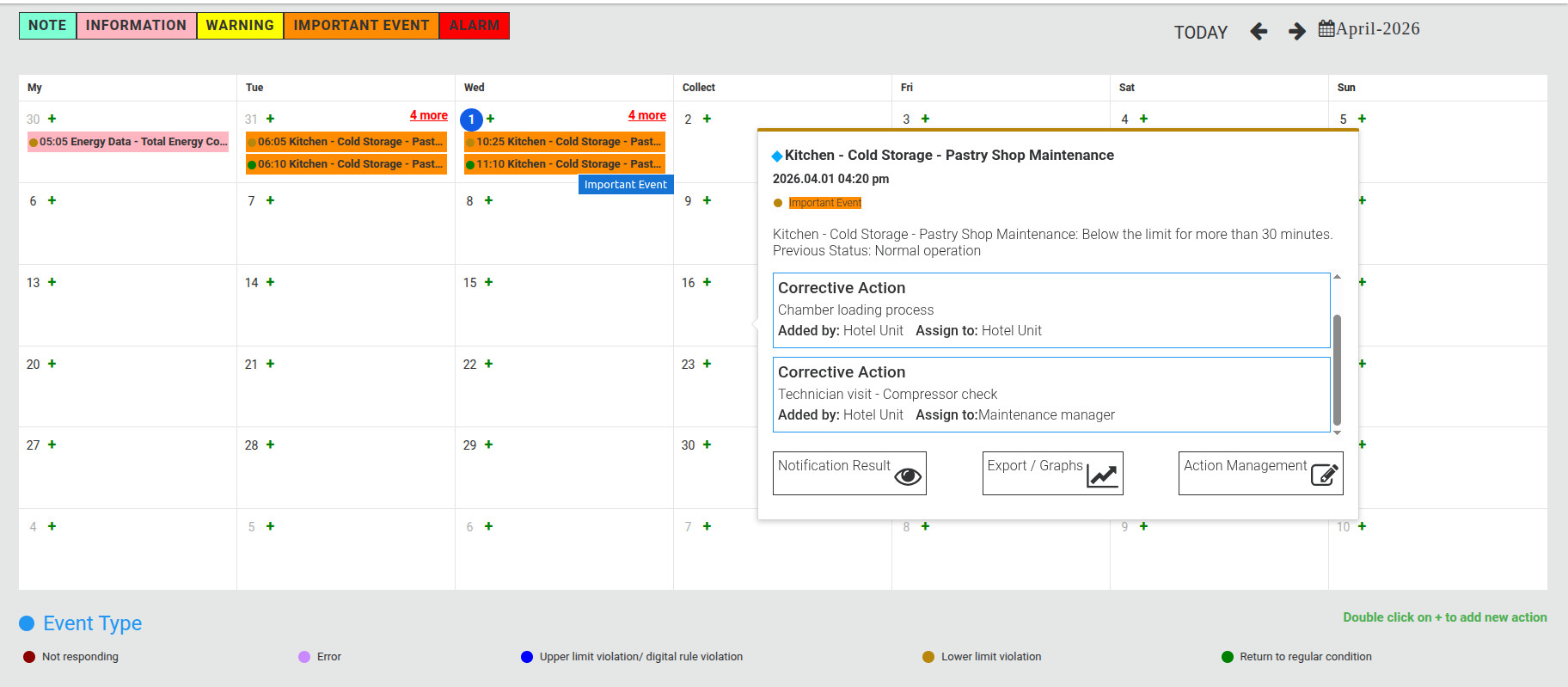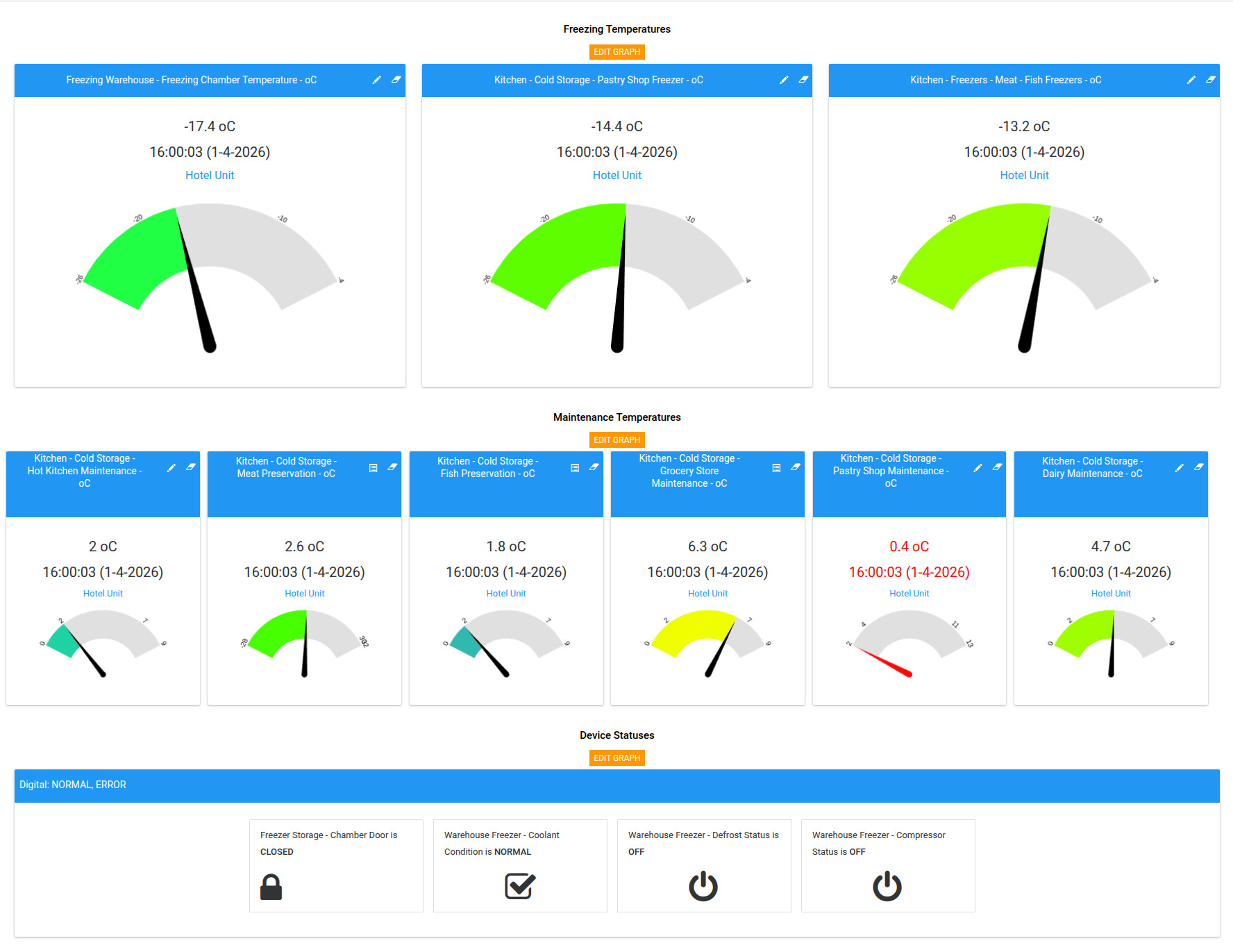Hotel kitchen – Integration with cold room controllers (chilling/freezing) – Temperature, door status, and defrost monitoring – HACCP & ISO compliance – Cold room temperature logs
