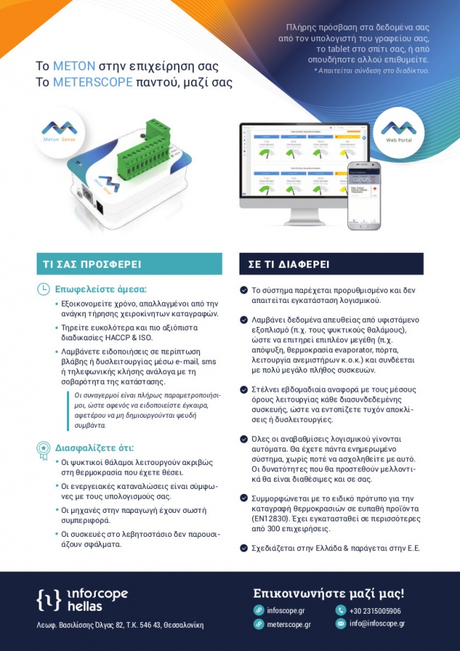 Παρακολούθηση θερμοκρασίας και ψηφιακών εισόδων (κατάσταση λειτουργίας, πόρτα κ.α.) ψυκτικών θαλάμων, ψυγείων, καταψύξεων, χώρων αποθήκευσης προϊόντων και άλλων συσκευών με 8 ενσωματωμένες είσοδοι και δυνατότητα επέκτασης. Μεγάλη διαθέσιμη γκάμα αισθητήρων για την καταγραφή θερμοκρασιών εκτεταμένου εύρους (-200oC, +1800oC), εξαιρετική ακρίβεια και καταγραφή σε μεγάλες αποστάσεις με το Meton Sense Plus