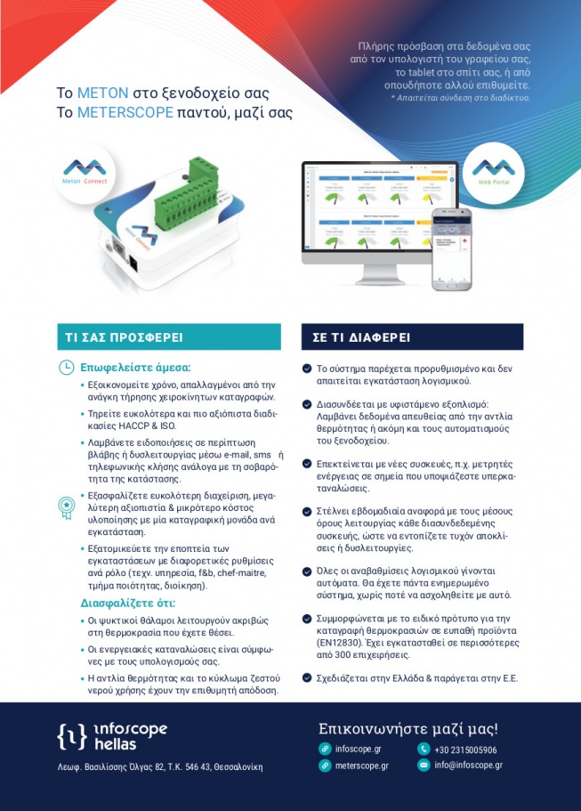 Παρακολούθηση θερμοκρασίας και ψηφιακών εισόδων (κατάσταση λειτουργίας, πόρτα κ.α.) ψυκτικών θαλάμων, ψυγείων, καταψύξεων, χώρων αποθήκευσης προϊόντων και άλλων συσκευών με 8 ενσωματωμένες είσοδοι και δυνατότητα επέκτασης. Μεγάλη διαθέσιμη γκάμα αισθητήρων για την καταγραφή θερμοκρασιών εκτεταμένου εύρους (-200oC, +1800oC), εξαιρετική ακρίβεια και καταγραφή σε μεγάλες αποστάσεις με το Meton Sense Plus